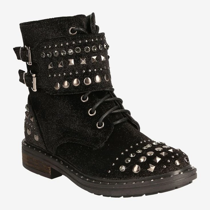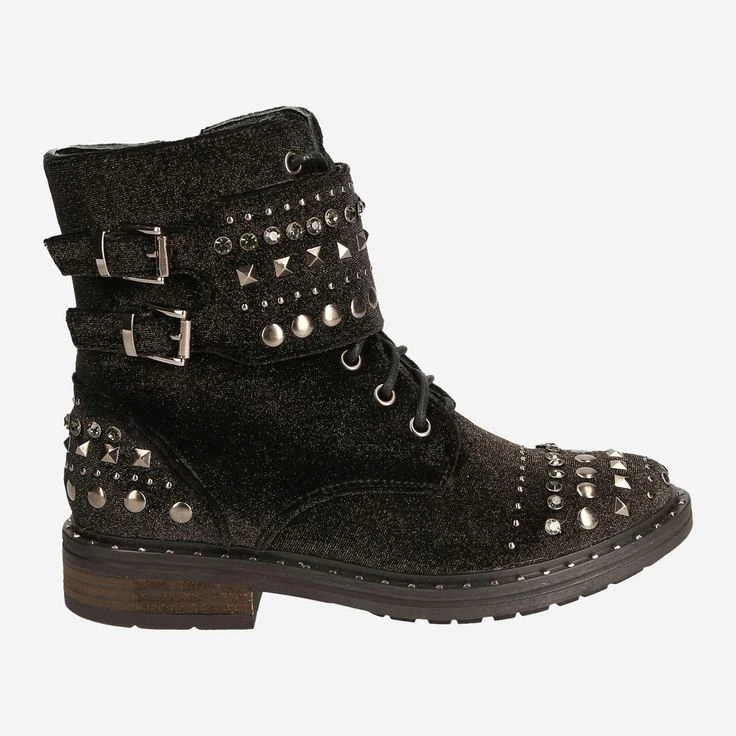 - Profile sole, stretch inserts, jewelry application, stud application, rhinestones, metal closure, zipper closure