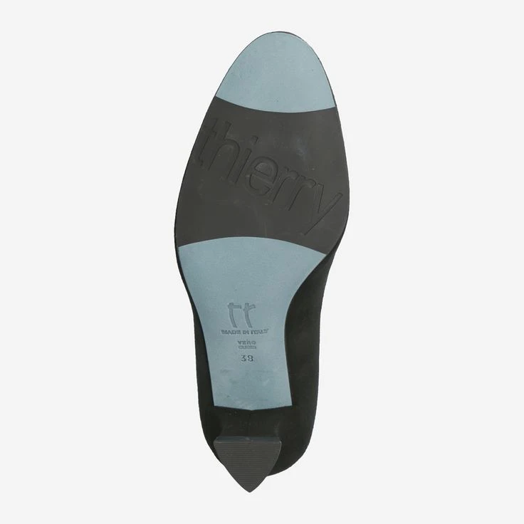 Black pumps from Thierry Rabotin made of soft suede. Inside the shoe is lined with leather. The leather sole has a rubber tread. The pumps have a curved heel, with a heel height of about 35 mm.