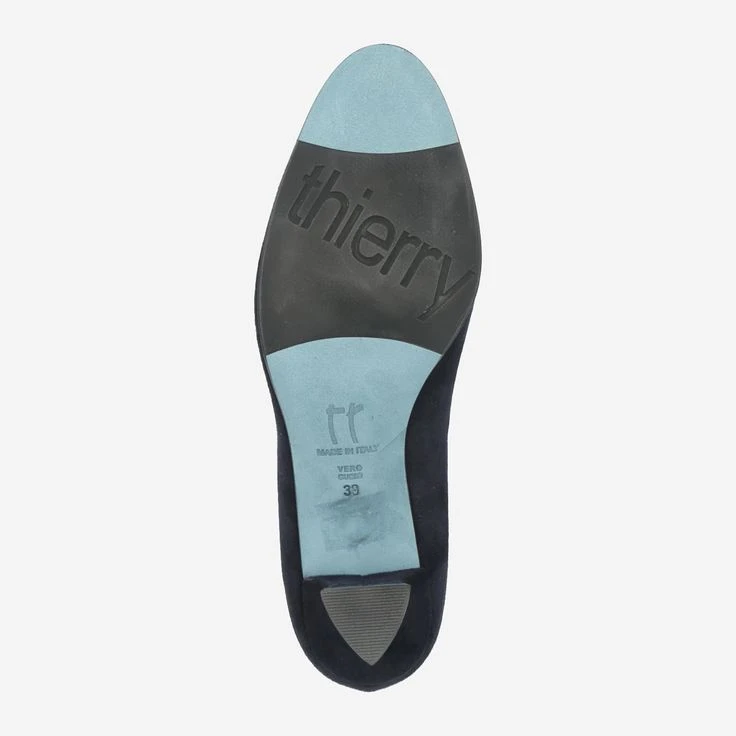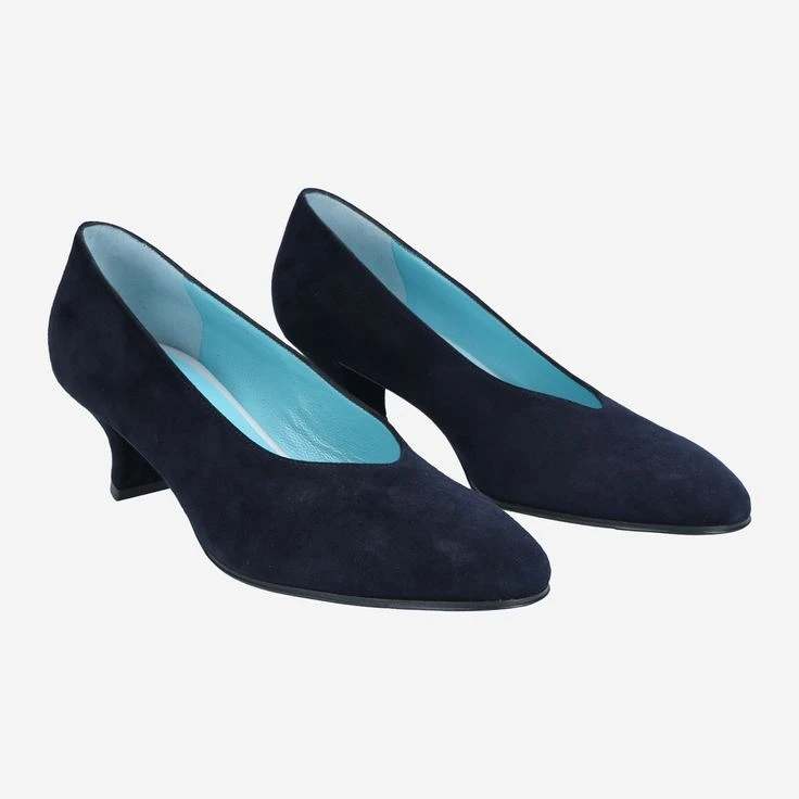 Dark blue pumps from Thierry Rabotin made of soft suede. Inside the shoe is lined with comfortable leather. The leather sole has a rubber tread. The pumps have a curved heel, with a heel height of about 35 mm.