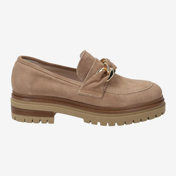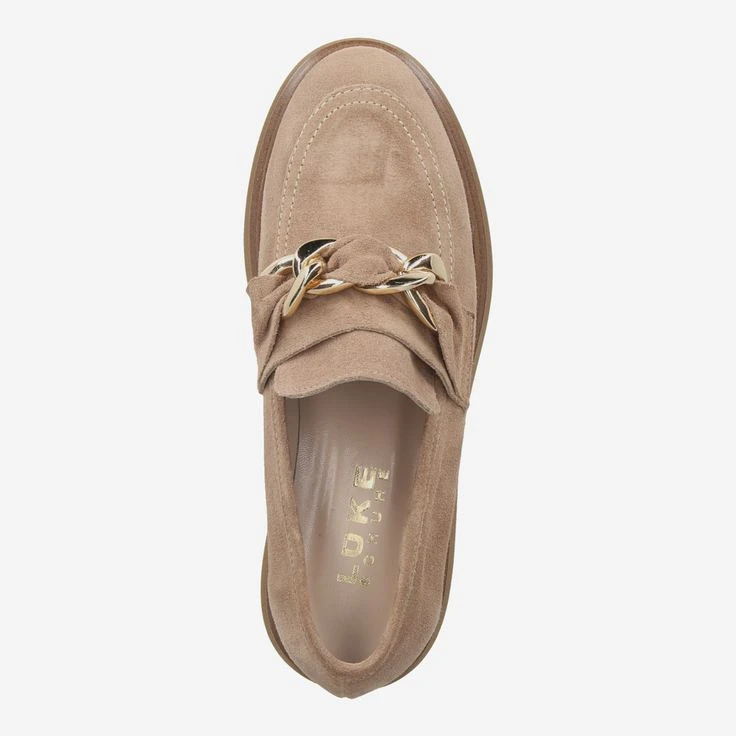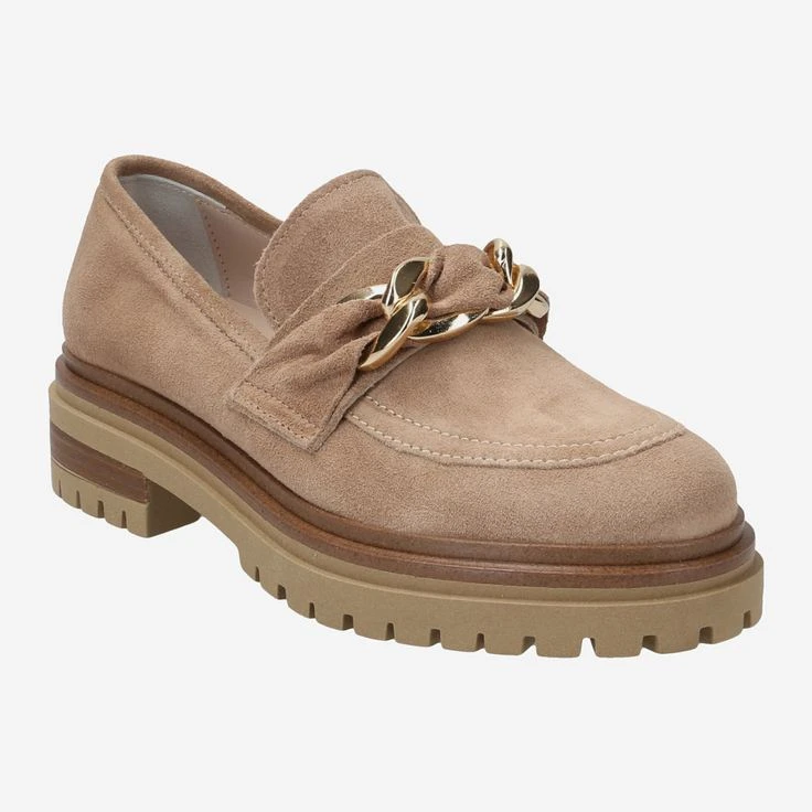 Enjoy this glamorous business loafer from Schuhe Lüke! It combines traditional design with pure luxury! Beige suede is refined in this model „Adriel“ by a loafer application of gold-colored chain elements. The effective platform sole lifts this model to the next level in terms of fashion! With it you make an excellent choice!