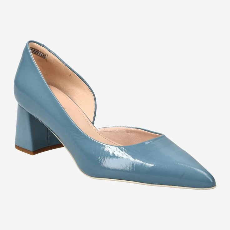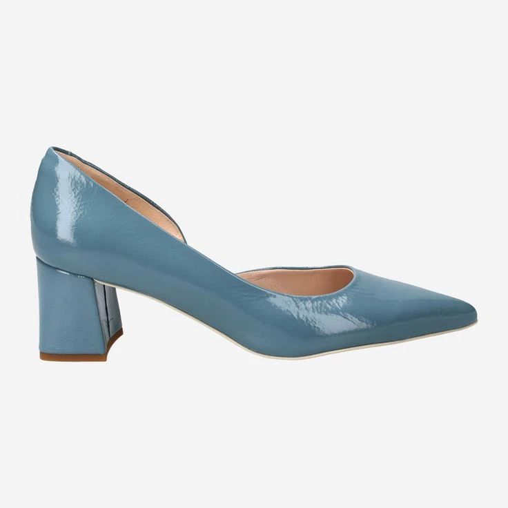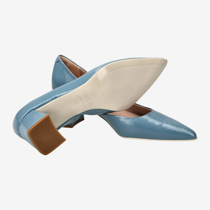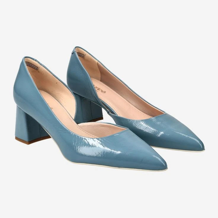 - Block heel, breathable, flexible crumpled varnish, pointed shape, open design on the side, textile „stopper“.