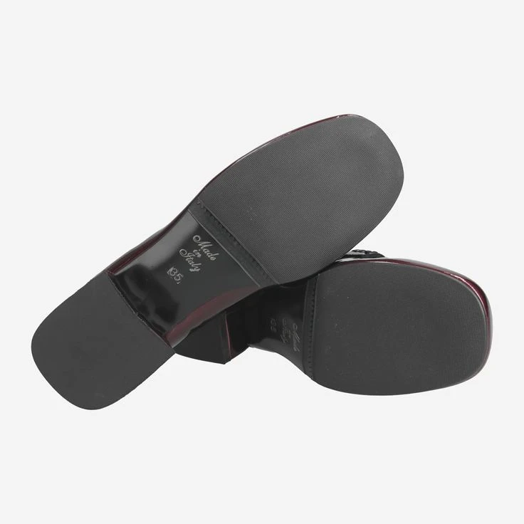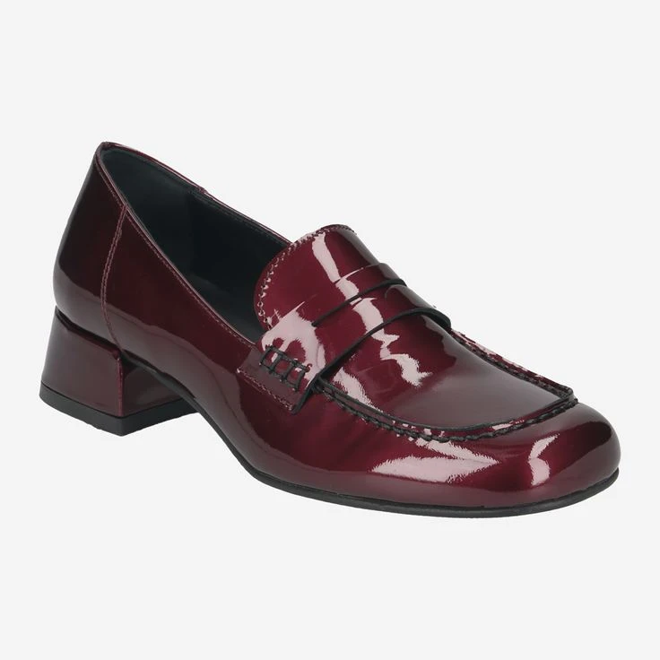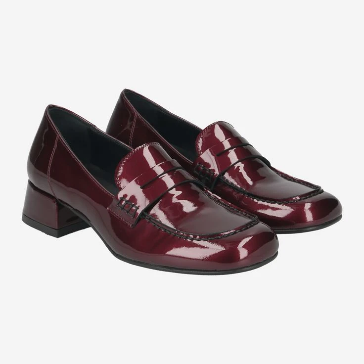 - Block heel, loafer application, decorative stitching, patent look with „wet look effect“ and noble wet shimmer