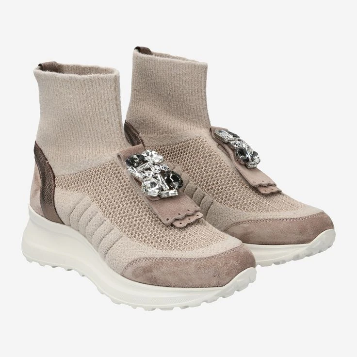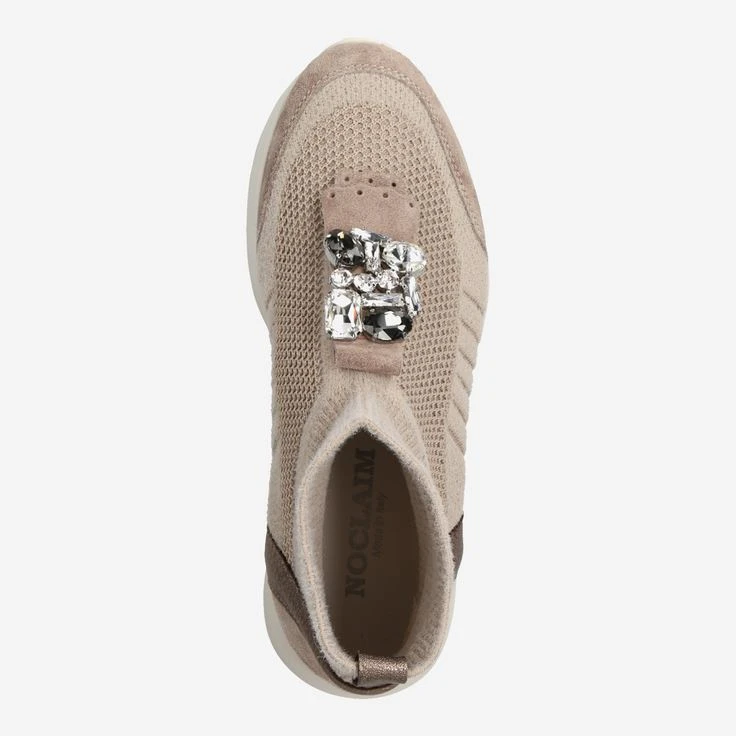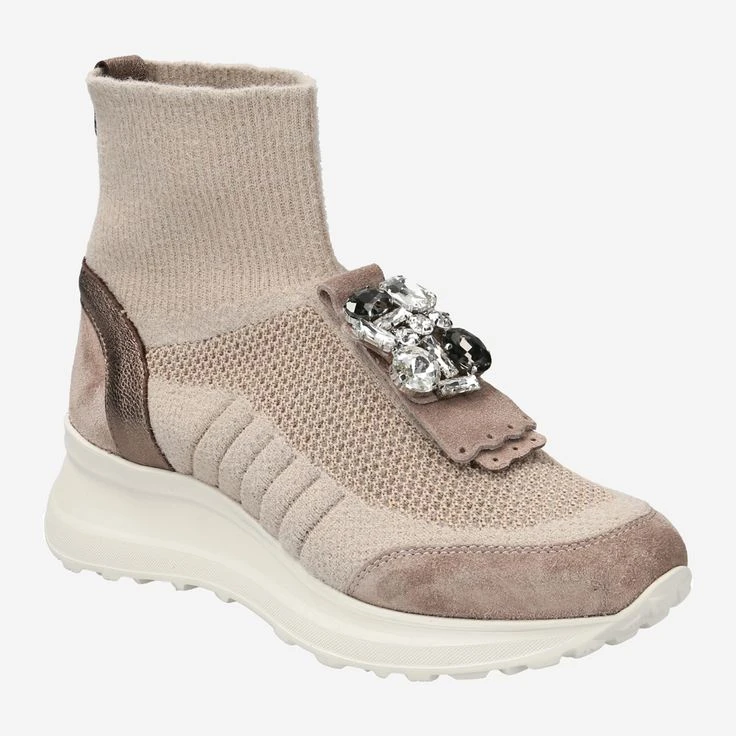 - Exchangeable footbed, suitable for insoles, wedge heel, spiked heel, statement-style jewelry appliqué, bronze metallic entry loop, knit look, super flexible, conformable upper (sock feeling!).