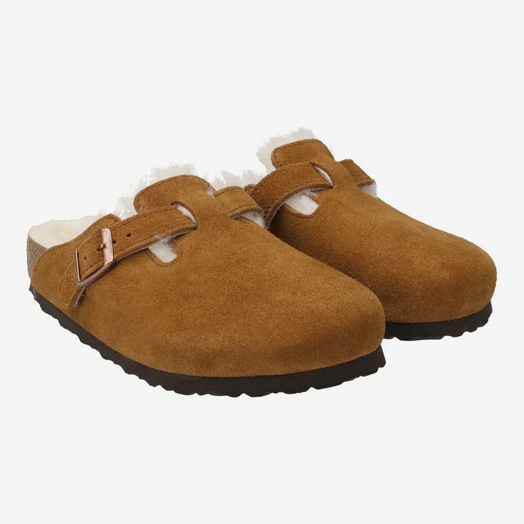 With „Boston“ from Birkenstock you enjoy the luxury of cozy warm feet! Because the mule gives you cozy-soft comfort through its inner lining made of 100% fur (lambskin). The brown suede leather fits perfectly with the cozy „at home feel-good look“. You’ll enjoy the brand’s signature natural cork footbed, as well as a non-slip rubber sole. So you spend cold winter days in cozy home – and with warm feet!, Reduced single pair!