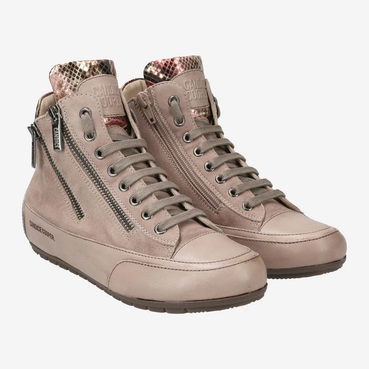 This high sneaker of the Italian manufacturer Candice Cooper is definitely a fashion statement! The handmade model „Lucia Zip Stone“ inspires with the material mix of light brown smooth leather and soft suede. A sophisticated addition of spectacular highlights makes this cult sneaker your new favorite shoe: details made of coated leather in the trendy animal look, as well as three diagonal zippers (2 x decorative, 1 x functional) skillfully put the casual street style in the limelight!