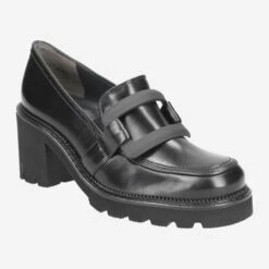 - leather covered block heel, loafer application in trendy chain design (matt black