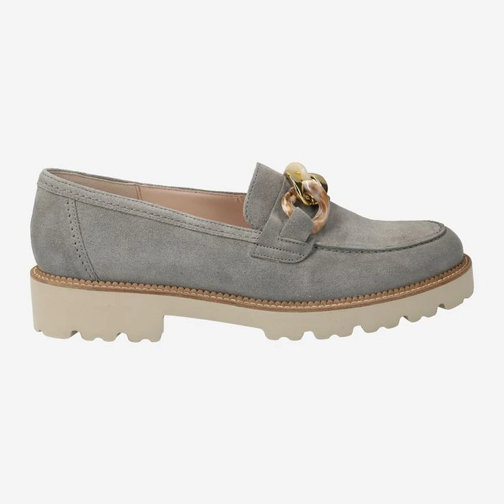 - Block heel, loafer application in trendy chain look, contrast stitching along the last, breathable