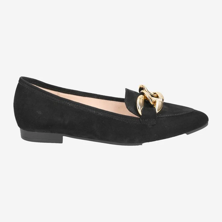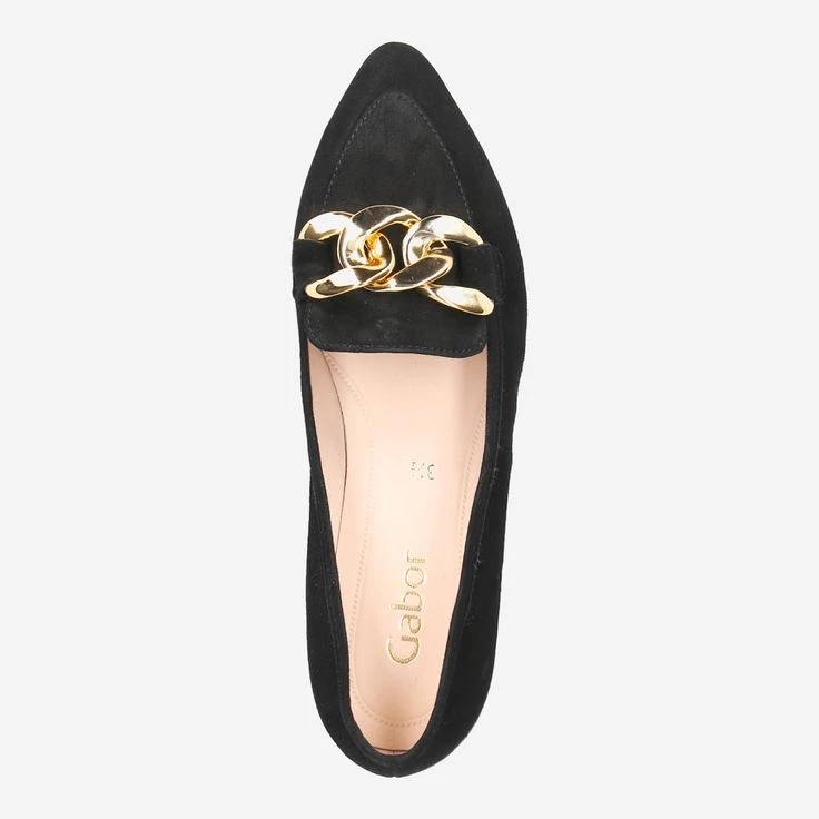 Style and elegance is always en vogue! Enjoy your elegant appearance with this high-quality, breathable penny loafer from the house of Gabor. The black suede convinces with precise workmanship and flexible adjustment. The almond-shaped tip underlines the feminine design, and gives you a self-confident appearance. The gold-colored chain links of the loafer application round off this business shoe extravagantly!, Reduced single pair!
