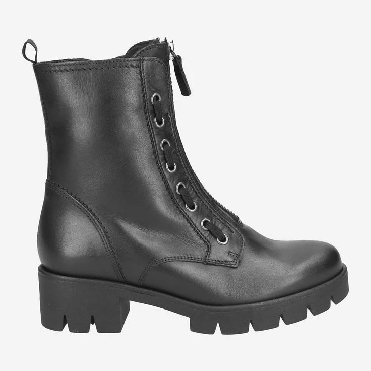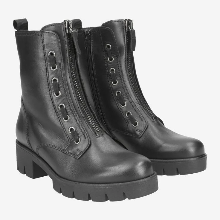 - Warm lining, exchangeable footbed, suitable for insoles, entry loop, block heel, side zipper, center zipper with decorative lacing details on the lacing strip, leather application