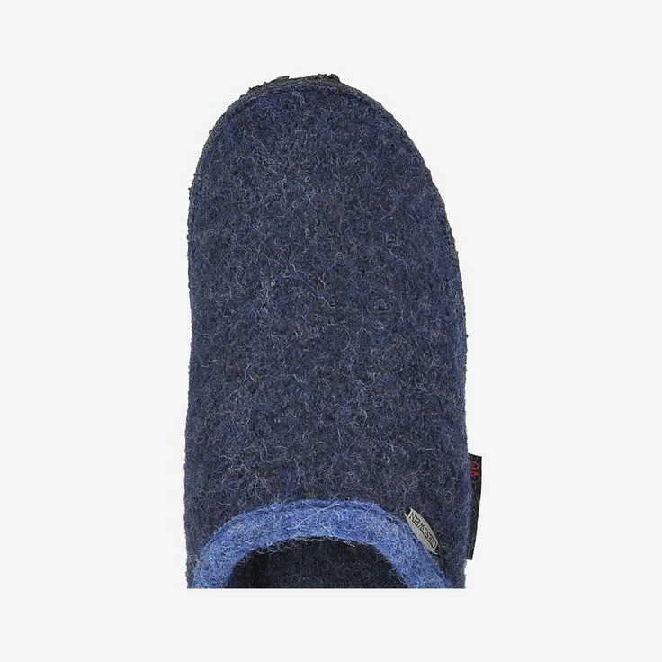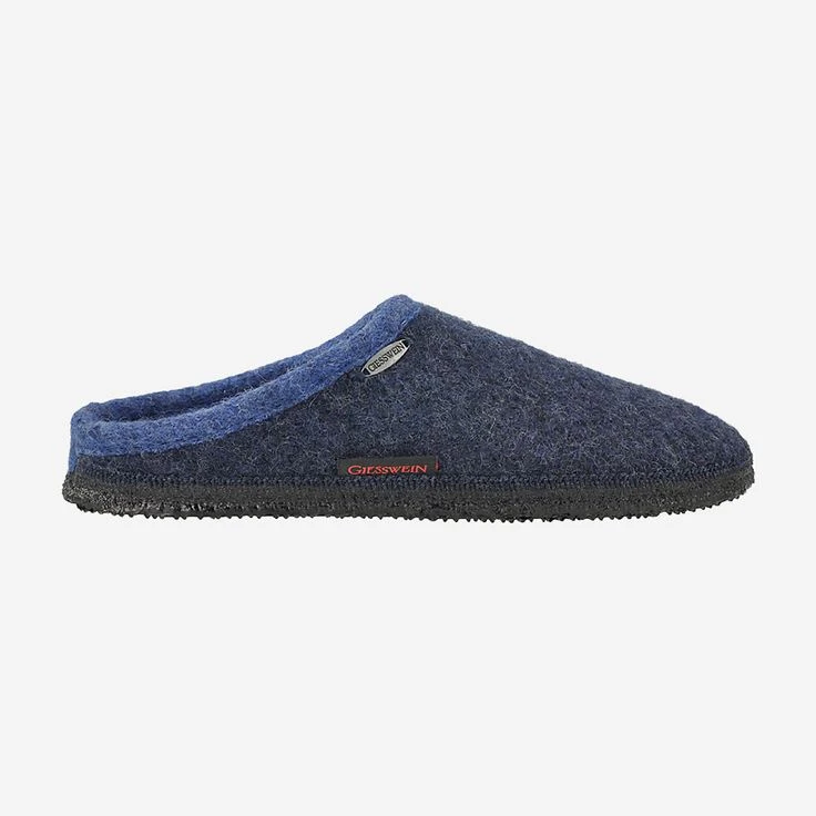 Dark blue slippers from Giesswein. The upper material and the inner lining, as well as the cover sole are made of 100% virgin wool. A non-slip rubber sole ensures a good wearing comfort, Reduced single pair!