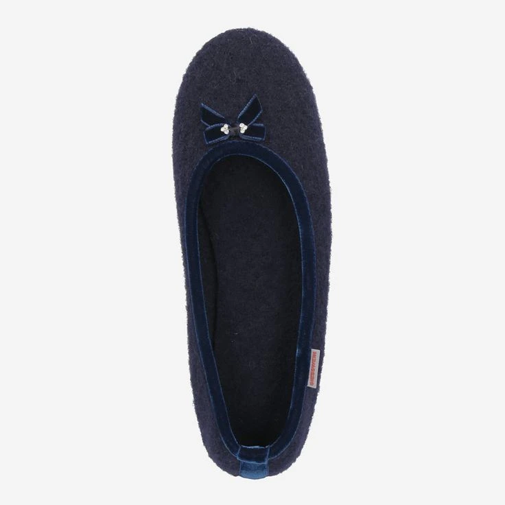 With this blue slipper you will enjoy the comfort of pure wool and the shapely design of a ballerina. The rolled wool warms your foot ideally, is breathable and as a pure natural material always a good choice. The model „Hohenau“ by Giesswein is complemented by a non-slip, stable sole made of rubber, so that you step safely. The hem of dark blue velvet is decorated by a small bow with rhinestones.