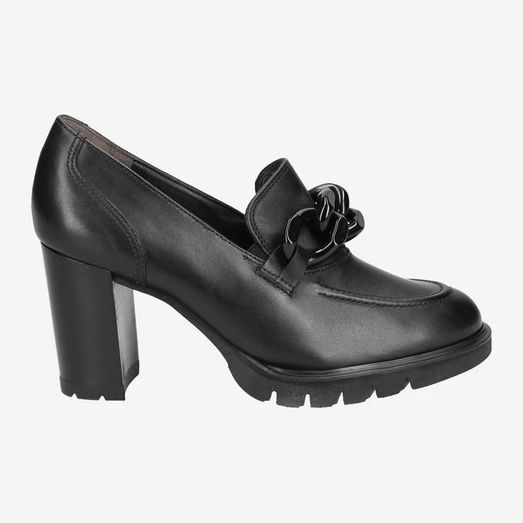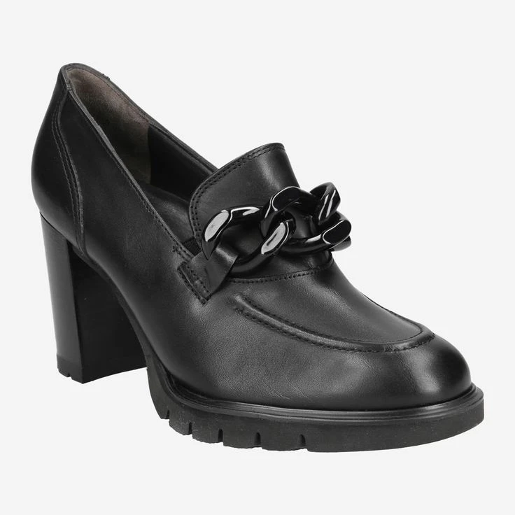 - Block heel, loafer application, decorative stitching, stretch inserts