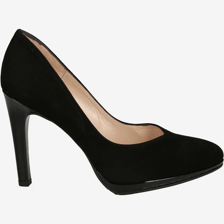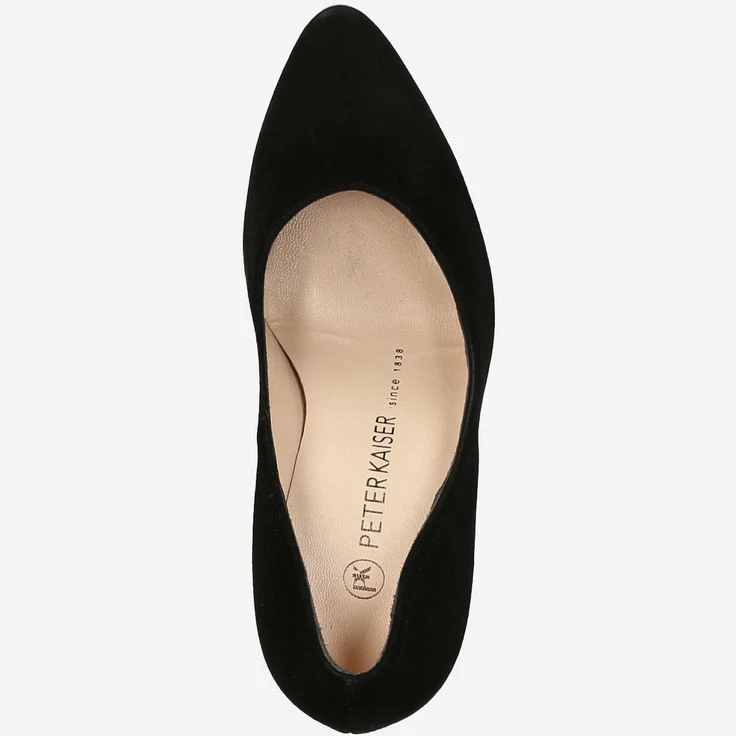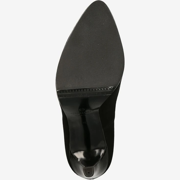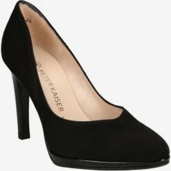 Black ladies pumps from Peter Kaiser. The upper is made of suede, the lining is lined with leather. The pumps have a leather insole and a rubber sole. The heel is about 105mm high, the platform about 10mm, both are covered with patent leather.