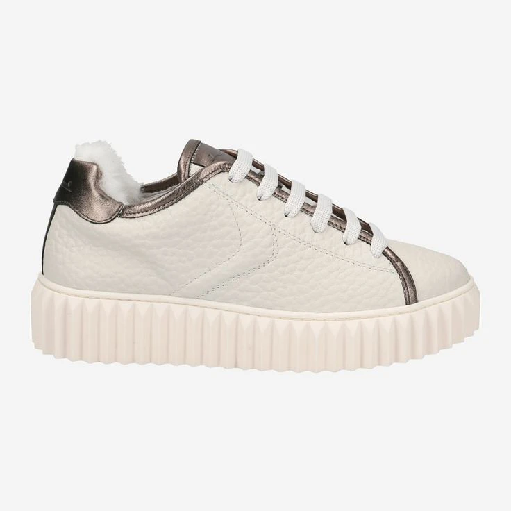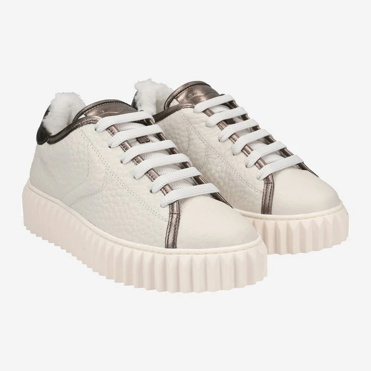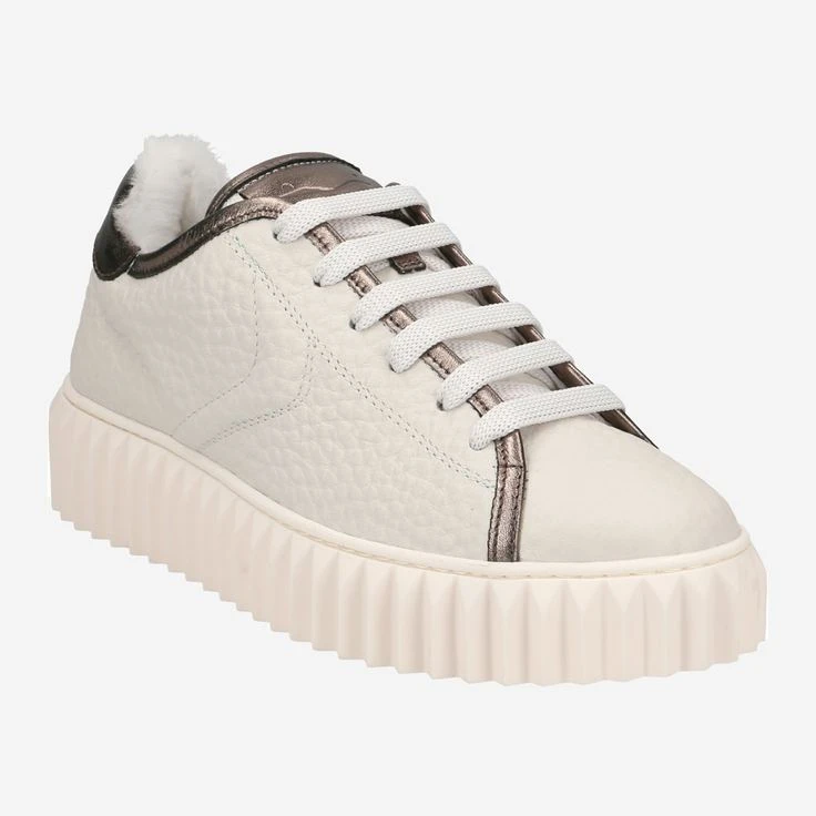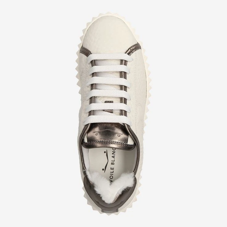 With ADELE by Voile Blanche you can enjoy casual street look in the highest quality. The naturally grained, white leather is refined by details in bronze metallic coated leather at the hem and heel. The tongue and heel area is additionally complemented by a cuddly soft warm lining (100% polyester). The innovative charm of this lace-up shoe is rounded off by the grooved platform sole, which gives this cream piece a futuristic touch!